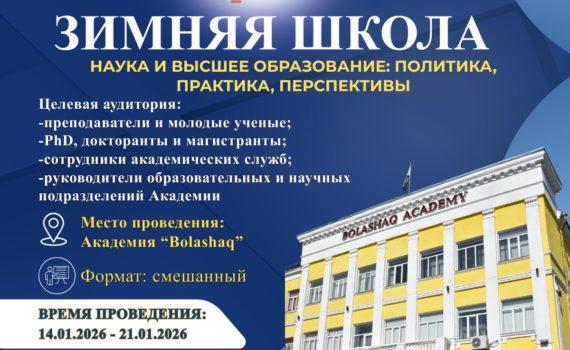 Академия «Bolashaq» информирует Вас о проведении 14-21 января 2026 года Зимней школы – 2026 «Наука и высшее образование: политика, практика, перспективы», посвященной 30-летнему юбилею Академии.Цель Зимней школы: формирование у участников системного понимания современных вызовов науки и высшего образования, развитие управленческих, исследовательских и методических компетенций.