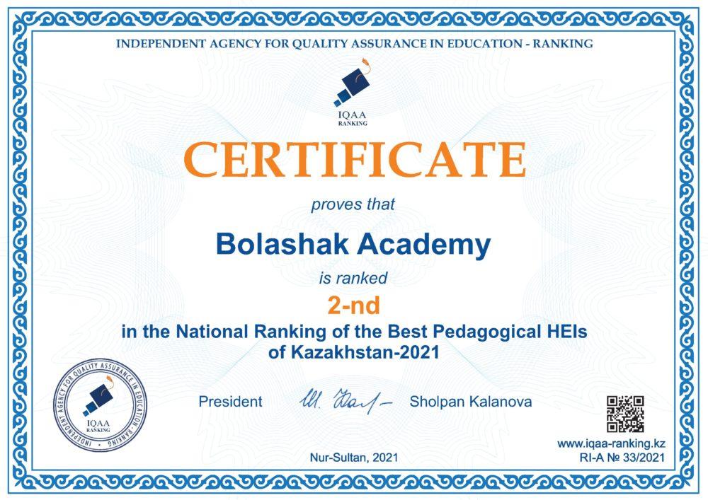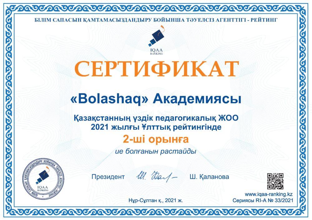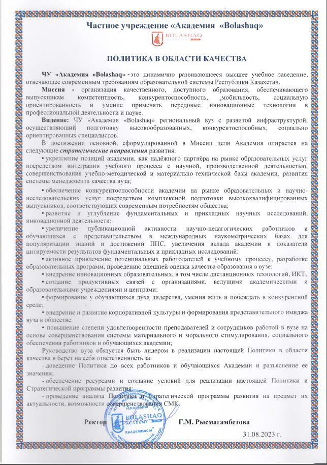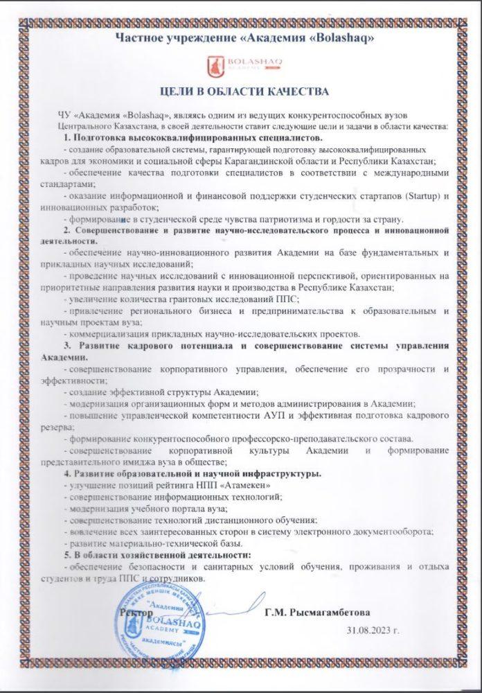 «Bolashaq» Академиясының миссиясы – түлектердің білім деңгейін, бәсекеге қабілеттілігін, ұтқырлығын, әлеуметтік бағдарлануын және кәсіптік қызмет пен ғылымда озық инновациялық технологияларды қолдана білуін қамтамасыз ететін сапалы, қолжетімді білім беруді ұйымдастыру.