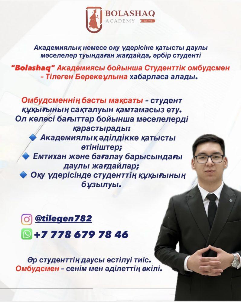 Құрметті студенттер! Егер сізде оқу, құқықтық мәселелер немесе студенттік өмірге байланысты сұрақтар мен келеңсіз жағдайлар туындаса, өз өңіріңіздегі студенттік омбудсменге жүгінуге толық құқығыңыз бар.