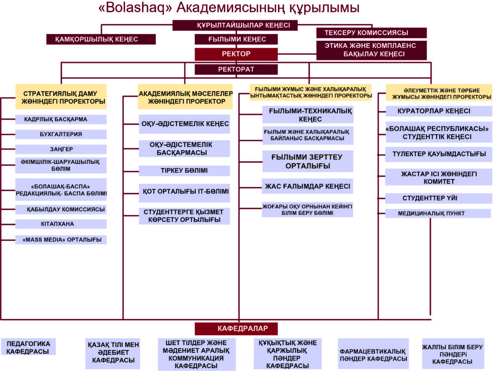 «Bolashaq» Академиясының құрылымы Құрылтайшылар кеңесі Ғылыми кеңес Тексеру комиссиясы Қамқоршылық кеңес Этика және комплаенс бақылау кеңесі Ректор Ректорат Бас инженер «Айналайын» демалыс үйі Стратегиялық даму жөніндегі проректоры Кадрлық басқарма Бухгалтерия Заңгер Әкімшілік-шаруашылық бөлім “Болашақ-Баспа” редакциялық-баспа бөлімі Қабылдау комиссиясы Кітапхана «Mass Media» орталығы Академиялық мәселелер жөніндегі проректор Оқу-әдістемелік кеңес Оқу-әдістемелік басқармасы Тіркеу бөлімі ҚОТ орталығы IT-бөлімі Студенттерге қызмет көрсету орталығы Ғылыми жұмыс және халықаралық ынтымақтастық жөніндегі ПроректорҒылыми жұмыс және халықаралық ынтымақтастық жөніндегі проректор Ғылыми-техникалық кеңес Ғылым және халықаралық байланыс басқармасы Жас ғалымдар кеңесі «Қазіргі заманғы маңызды мәселелер» атты халықаралық журнал Ғылыми зерттеулер, гуманитарлық педагогика және педагогикалық тәлімгерлік орталығы Жоғары оқу орнынан кейінгі білім беру бөлімі Әлеуметтік және тәрбие жұмысы жөніндегі проректор Кураторлар кеңесі Жастар ісі жөніндегі комитет Медициналық пункт Студенттер үйі Асхана Тренажер залы Кафедралар Педагогика кафедрасы Қазақ тілі мен әдебиеті кафедрасы Шет тілдер және мәдениетаралық коммуникация кафедрасы Құқықтық және қаржылық пәндер кафедрасы Фармацевтикалық пәндер кафедрасы Жалпы білім беру пәндері кафедрасы