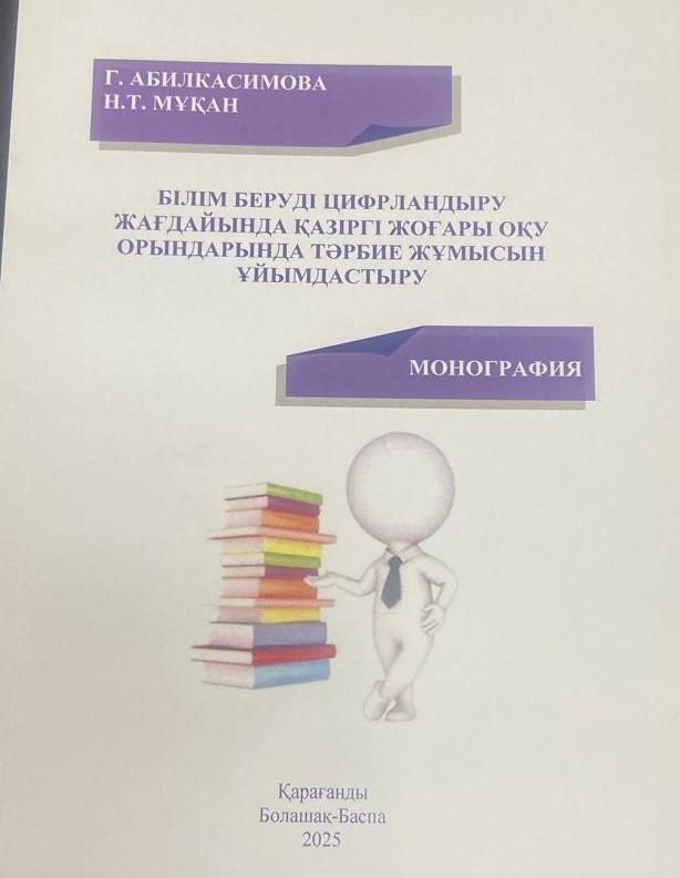 Монография. «Білім беруді цифрландыру жағдайында қазіргі жоғары оқу орындарында тәрбие жұмысын ұйымдастыру». Авторлар: Абилкасимова Г., Мұқан Н.Т.
