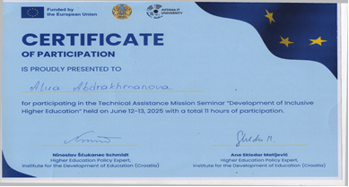Педагогика кафедрасының меңгерушісі пс.ғ.к. Әбдірахманова Алуа Сабитова 2025 жылғы 12-13 маусым аралығында Қазақстанның жоғары оқу орындарында инклюзивті білім беру мәселелеріне арналған халықаралық семинарға қатысты. Семинарды ҚР жоғары және жоғары оқу орнынан кейінгі білім комитеті және ҚР Erasmus+ұлттық кеңсесі ұйымдастырды. Семинар Astana IT University базасында өткізілді .