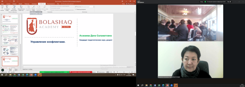2025 жылғы 02 қазанда «Bolashaq» академиясының ғылыми жұмыс және халықаралық ынтымақтастық жөніндегі проректоры Д.С. Асакаева «Атамекен» Кәсіпкерлер палатасы ұйымдастырған тәлімгерлерді оқыту бағдарламасы шеңберінде «Кәсіби қызметтегі қақтығыстарды басқару» тақырыбында онлайн-семинар өткізді.