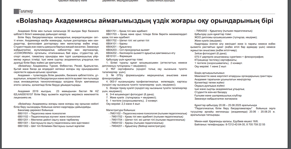 «Bolashaq» Академиясы – білім беру кеңістігінде өзіндік орны бар, заманауи талаптарға сай дамып келе жатқан жетекші оқу орны. Бұл туралы «Қарқаралы» газетінде жарық көрген мақалада кеңінен баяндалып, Академияның аймақтың үздік жоғары оқу орындарының біріне айналғаны атап өтілді.
