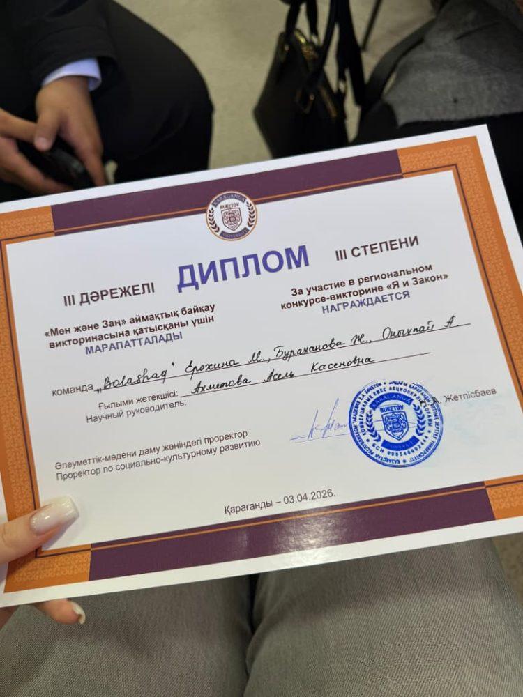 2026 жылғы 3 сәуірде академик Е.А. Бөкетов атындағы Қарағанды зерттеу университеті базасында «Мен және заң» атты байқау өтті. Байқауға «Bolashaq» Академиясынан Ерохина Марина, Бураханова Жұлдыз (Ю-23-1 тобы) және Орныхпай Аман (Ю-24-1 тобы) қатысты.