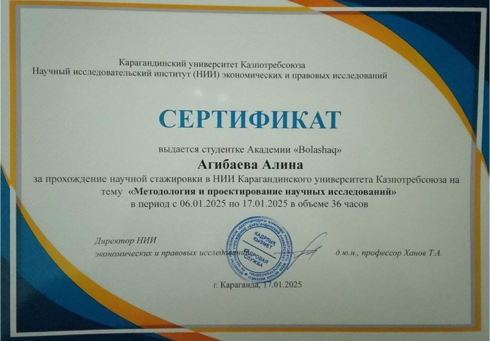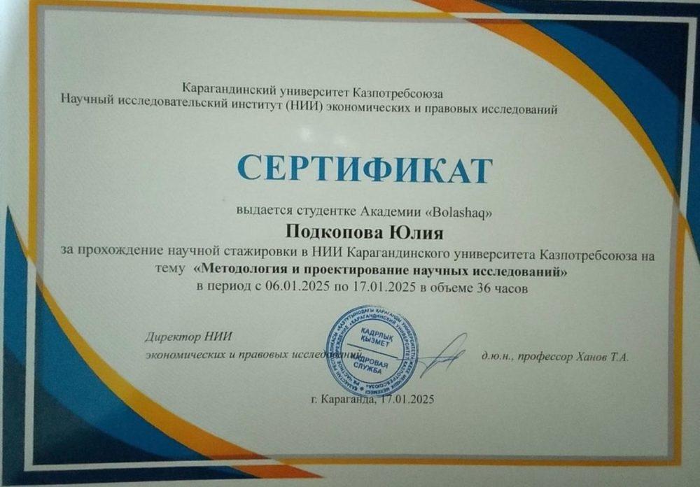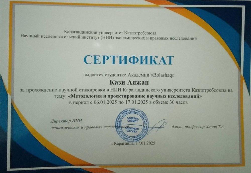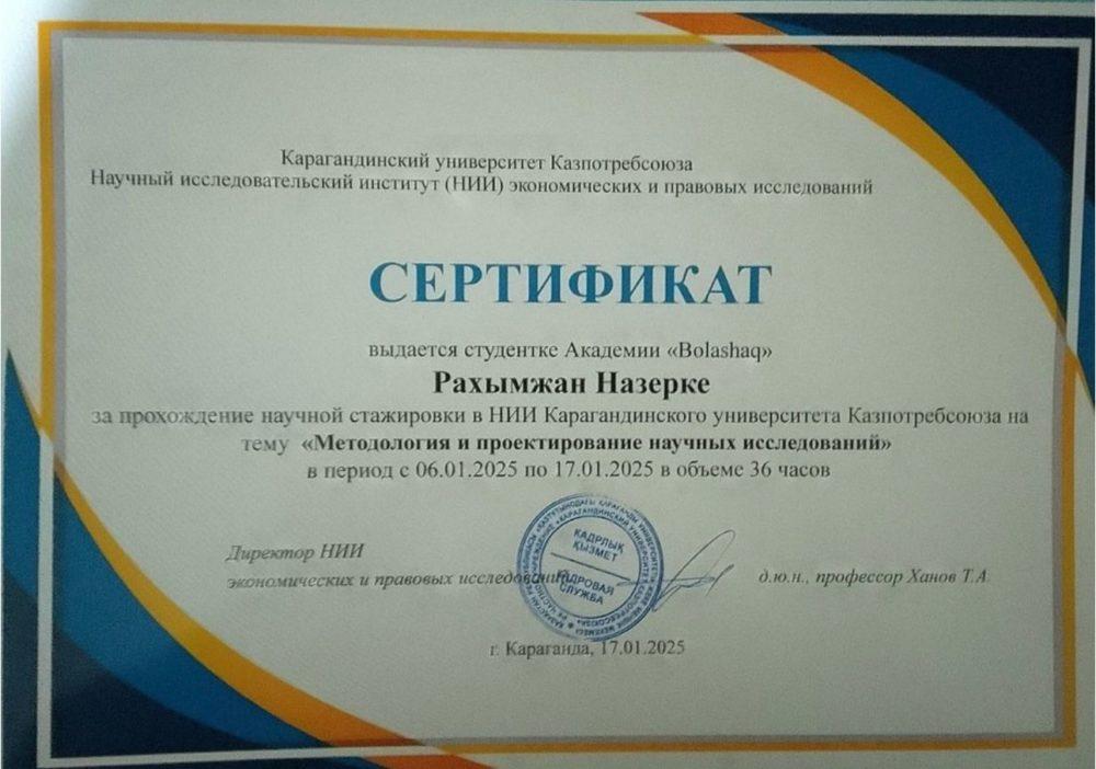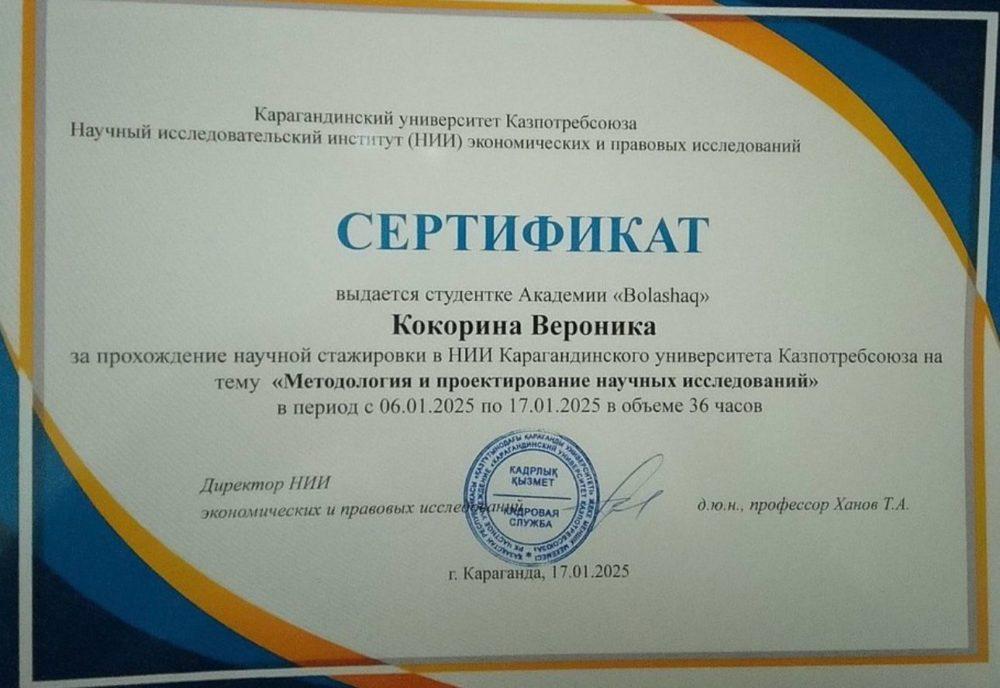 2024 жылғы 6-17 қаңтар аралығында ұстаз М.М. Момбекованың басшылығымен шет тілдері және мәдениетаралық коммуникация кафедрасының студенттері Қарағанды экономикалық университетінің жанындағы Ғылыми-зерттеу институтында 36 сағат көлеміндегі ғылыми тағылымдамадан өтті. Тағылымдаманың тақырыбы «Ғылыми зерттеулердің әдіснамасы және жобалау» болды.
