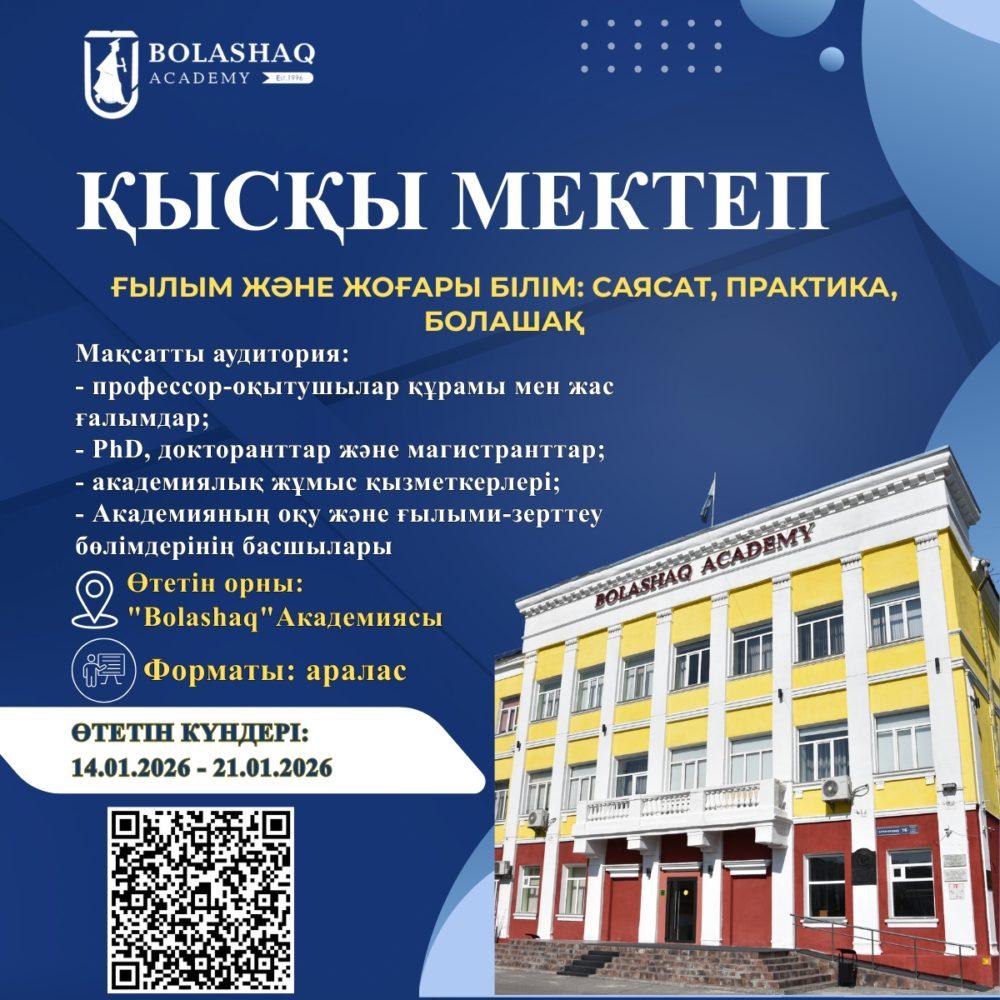 «Bolashaq» академиясы 2026 жылғы 14–21 қаңтар аралығында Академияның 30 жылдық мерейтойына орай «Ғылым және жоғары білім: саясат, практика, перспективалар» тақырыбындағы Қысқы мектеп – 2026 ұйымдастырылатыны туралы хабарлайды.