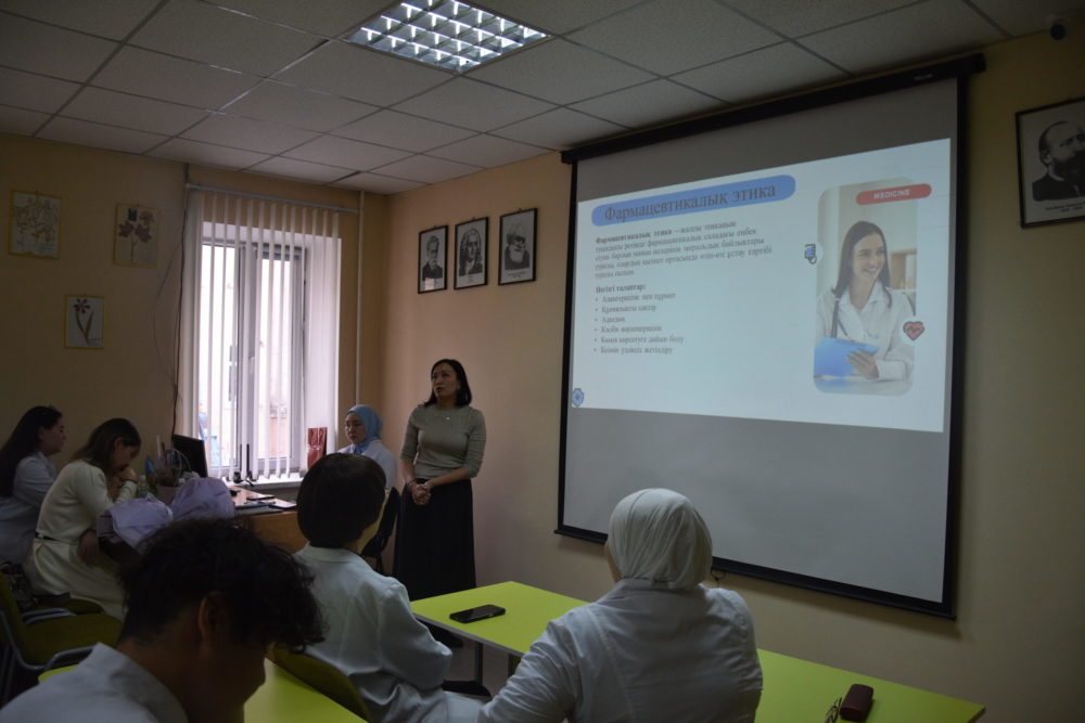 Іс-шара барысында студенттер белсенді қатысып, өз ой-пікірлерімен бөлісті. Фм-24-2 тобының студенттері Ермаханов Ернұрым, Абдрахманов Медеу және Сахиева Айдана жалпы этика мен фармацевтикалық этиканың негізгі айырмашылықтарына тоқталып, назарларын аударды.
