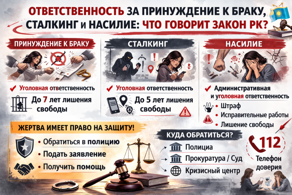 В 2025 году в Казахстане уголовная ответственность за принуждение к браку (ст. 125‑1 УК РК) и сталкинг (ст. 115‑1 УК РК) вступила в силу с 16 сентября. С момента действия закона по стране было зарегистрировано как минимум 7 уголовных дел о принуждении к браку (в регионах Караганда, Мангистау, Жамбыл, Туркестан, Шымкент) и несколько дел по сталкингу (Атырауская, Павлодарская области), к началу 2026 года МВД сообщало о примерно 8 возбужденных уголовных дел по сталкингу. Данные отражают только официально зарегистрированные уголовные дела; статистика за период до сентября отсутствует, а распространение дел по регионам и датам ограничено публикациями.