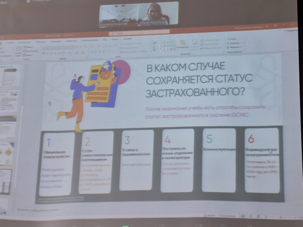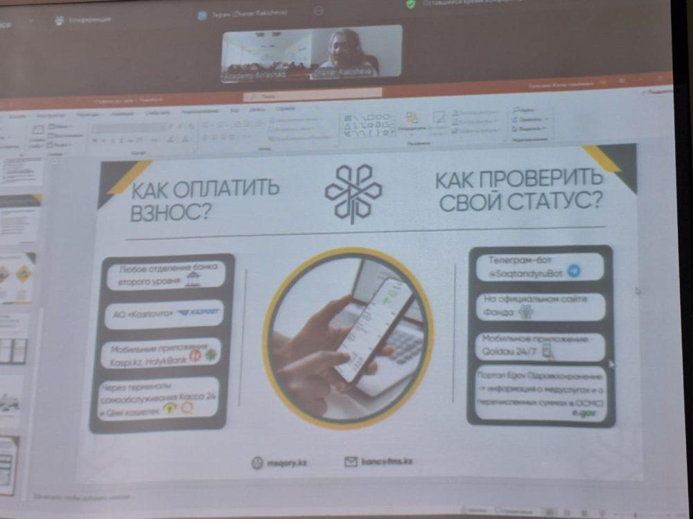 24.09.2025 года руководитель отдела по информированию населения и рассмотрению обращений филиала по Карагандинской области НАО ФСМС Ракишева Ж.У. провела встречу со студентами выпускного курса в режиме ZOOM конференции.