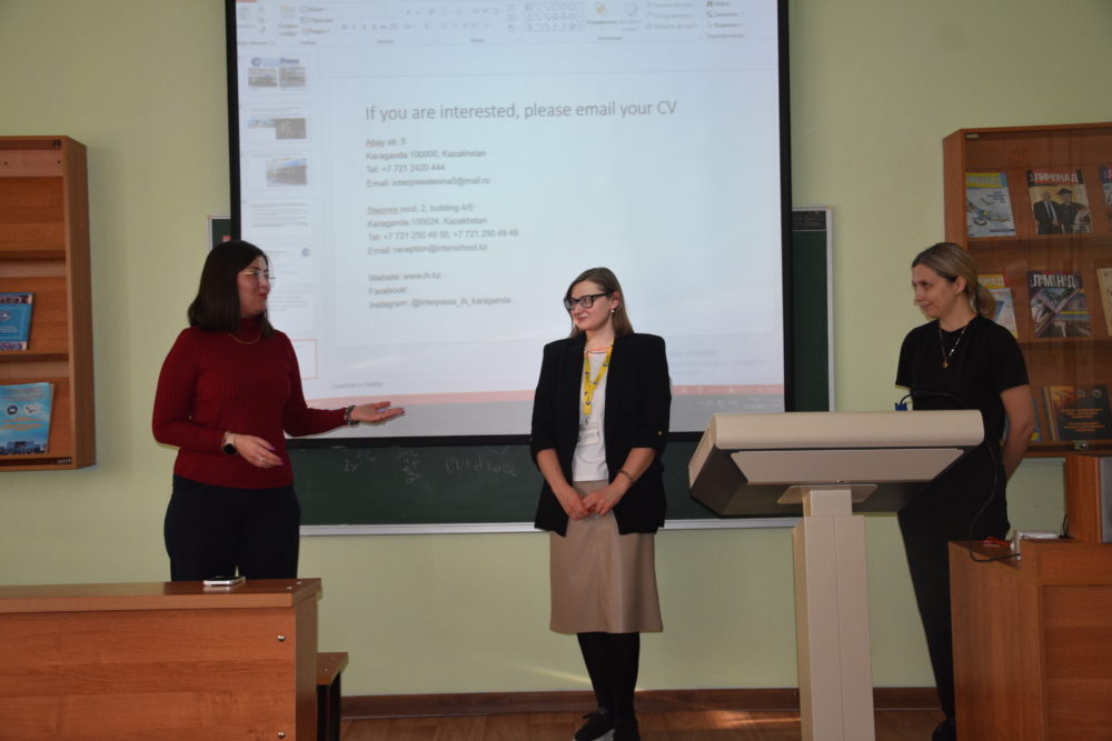 В ходе встречи представители компании «Interpess IH Karaganda» представили информацию о деятельности организации, перспективах профессионального роста и требованиях к кандидатам на вакантные должности. Особое внимание было уделено вопросам практического применения иностранных языков в профессиональной среде, возможностям прохождения стажировок и дальнейшего трудоустройства студентов.